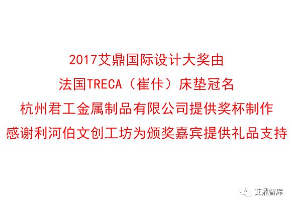 2017年艾鼎奖颁奖盛典由艾鼎智库、中国企业联合馆、东方视觉、联合中国数家权威学术机构共同举办,本次颁奖由法国TRECA(崔佧)床垫冠名,杭州君工金属制品有限公司协办,深圳市精实广告有限公司提供视觉支持,利河伯文创工坊为活动提供礼品支持的2017艾鼎奖国际设计大奖颁奖典礼暨艾鼎智库高峰论坛成功举行并圆满落幕。